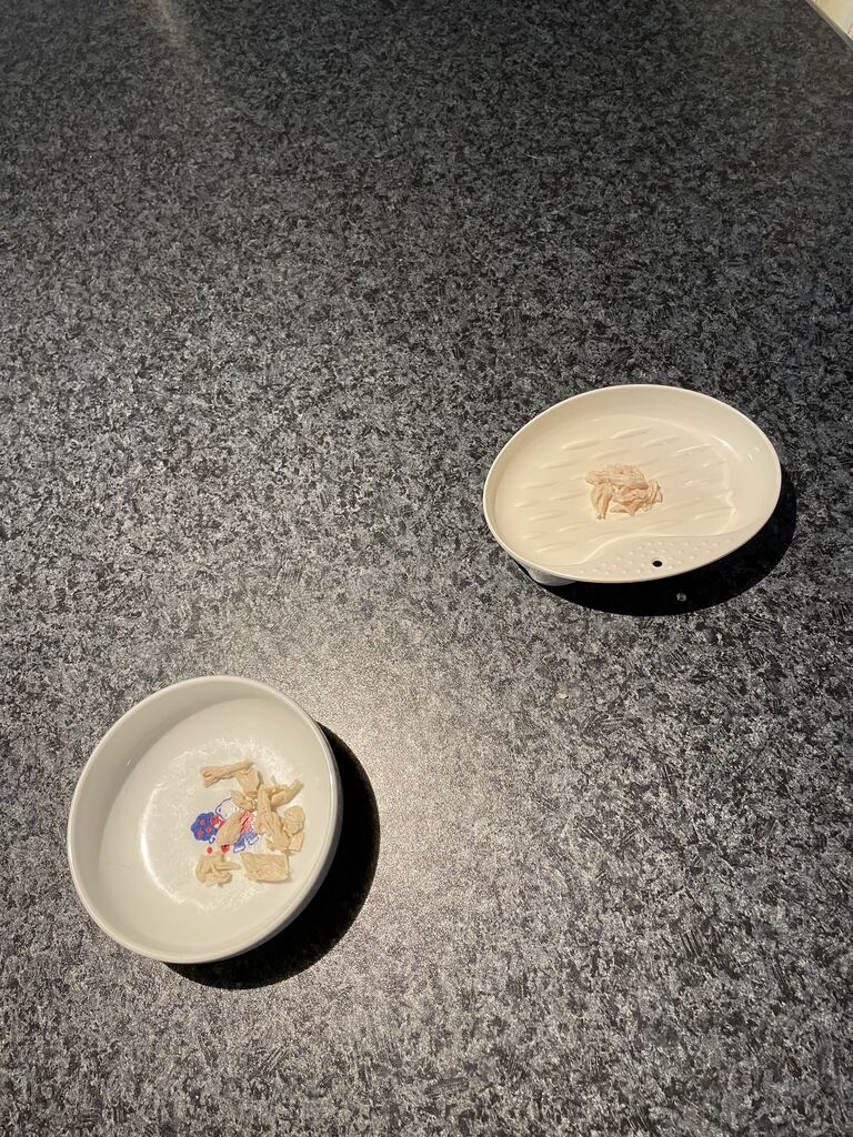 そして茹で上がったササミをお皿に入れてふたりの前に持って行く。