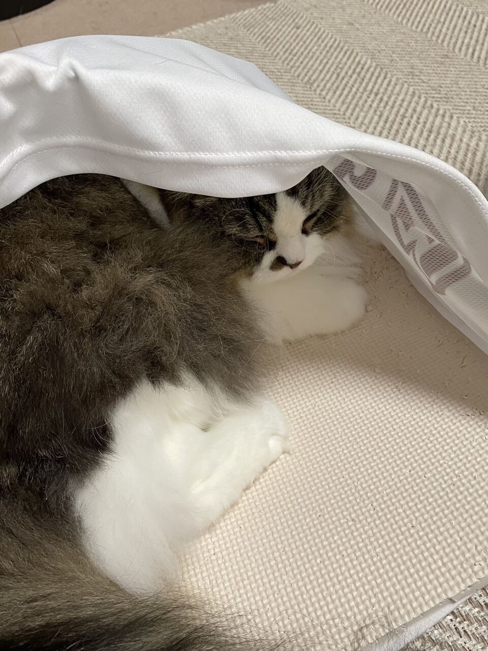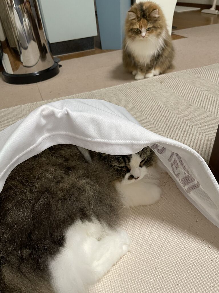 抜け毛だから痛くはないだろうけど構われるのが好きじゃないテンちゃん、猫テントの中に隠れる。