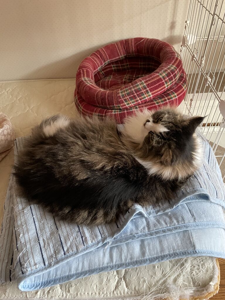 ふかふかベッドではなく冷感タオルケットの上で眠るテンちゃん