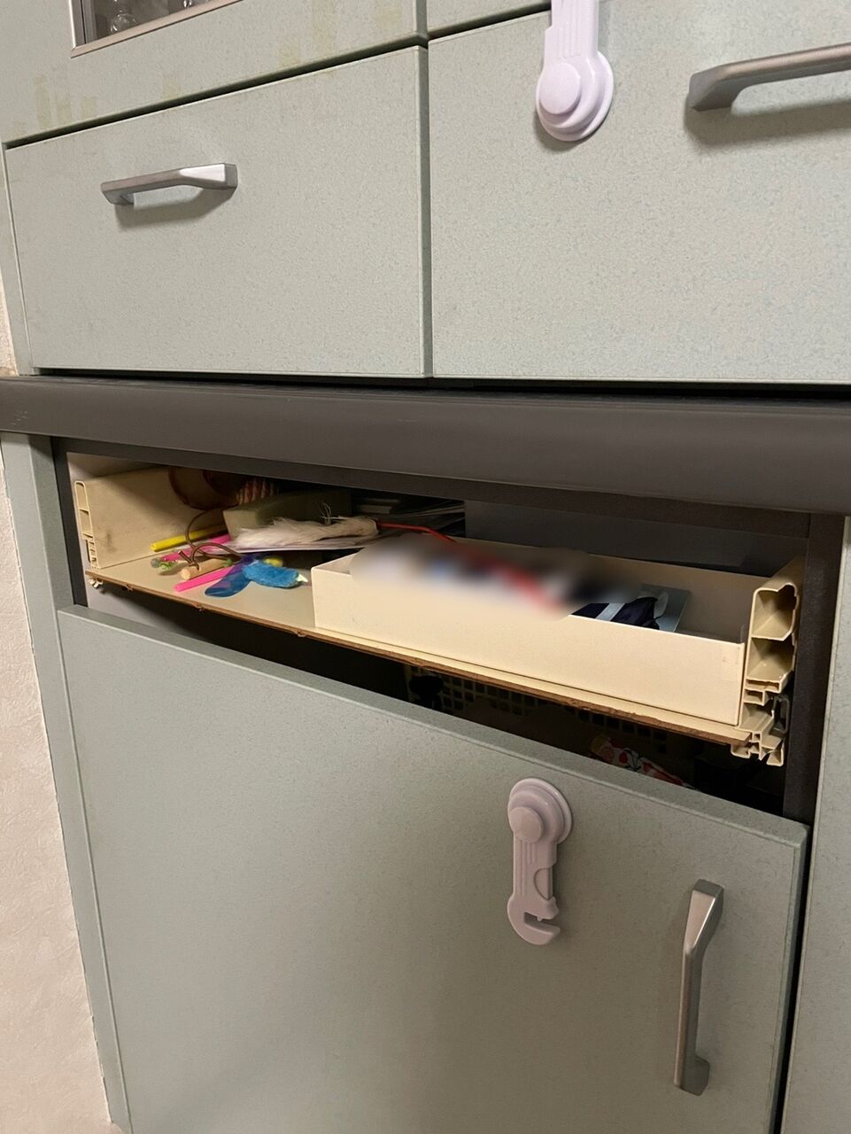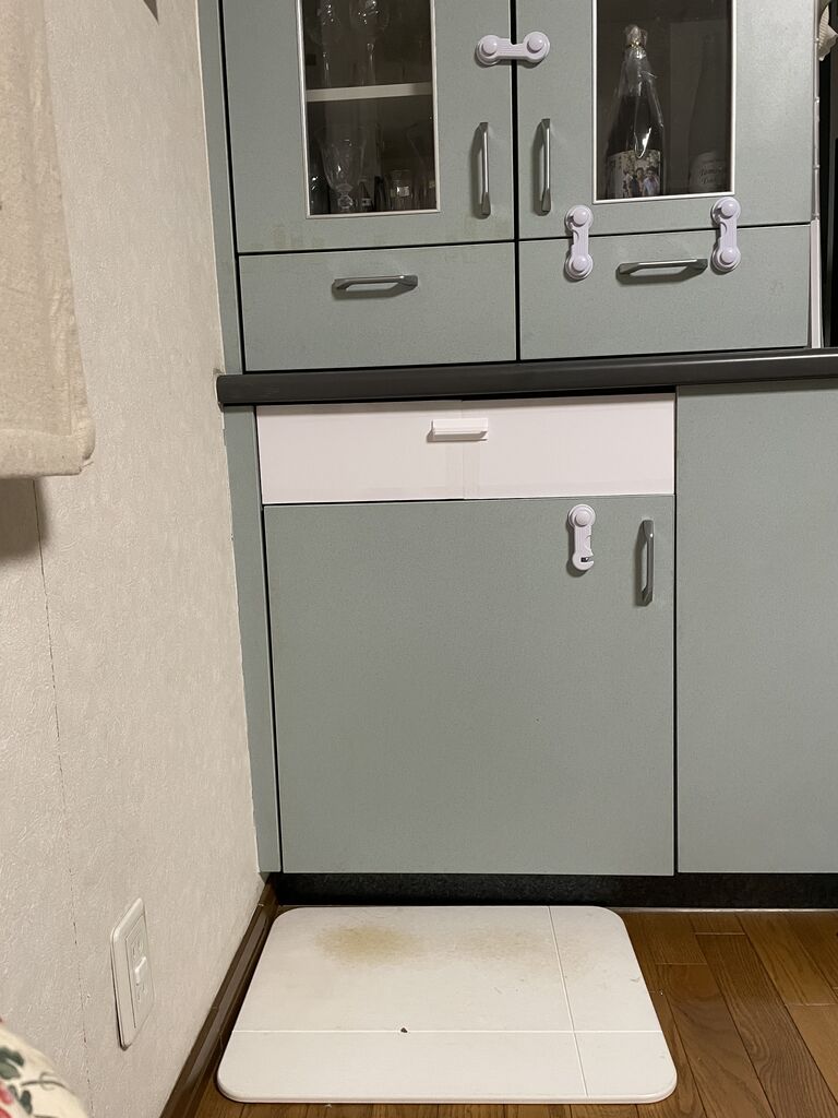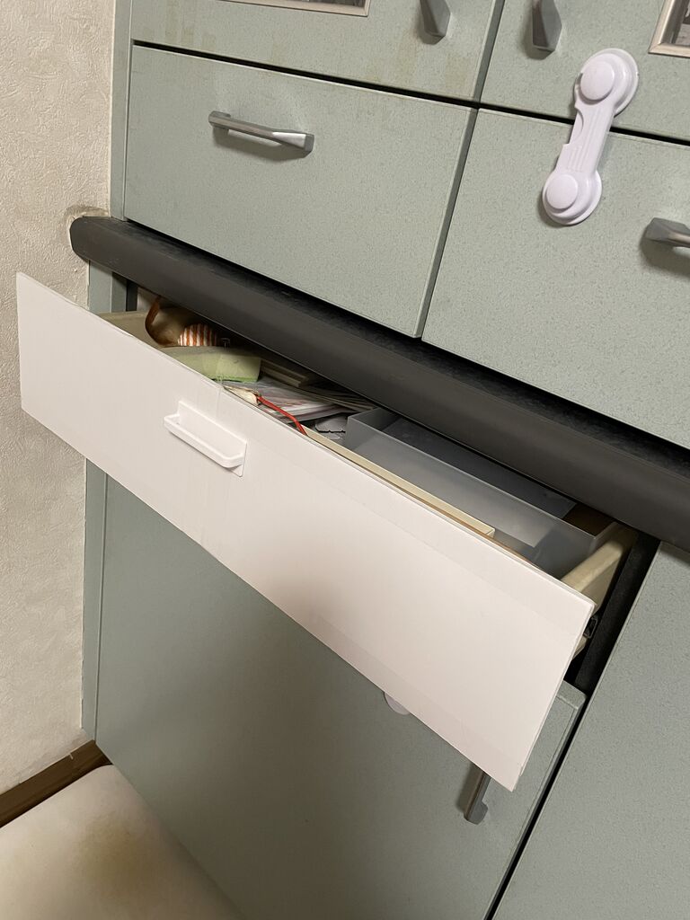 今回の引き出しは一番よく使う引き出し。サイドのプラスチック部分がもろくなってグラグラしていたところに、なぎが乗っかって完全に割れ前面が落っこちた。