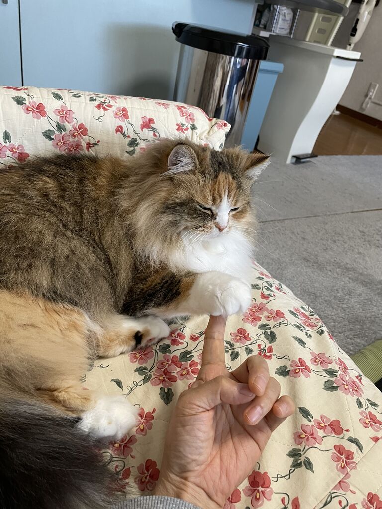 手を出すとお手のように乗せてくれるなぎの前足の肉球を、指先でプニュプニュして遊ぶ。