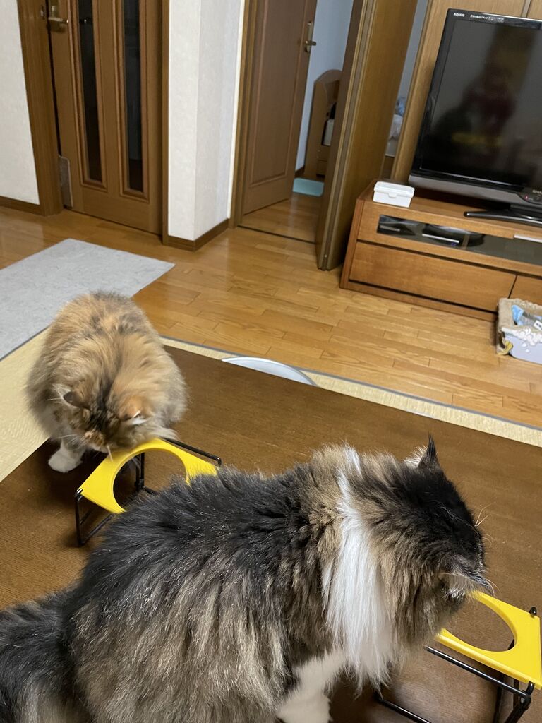 このやり方だとなぎがテンちゃんの普通食を、テンちゃんがなぎの療法食を食べてしまう可能性があるので、我が家は猫飼い6年目にして大きな食事改革をすることになった。
