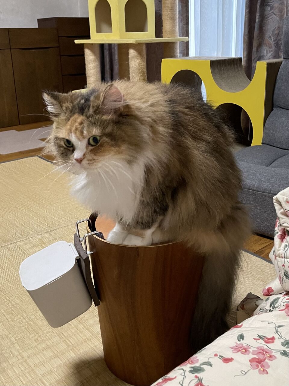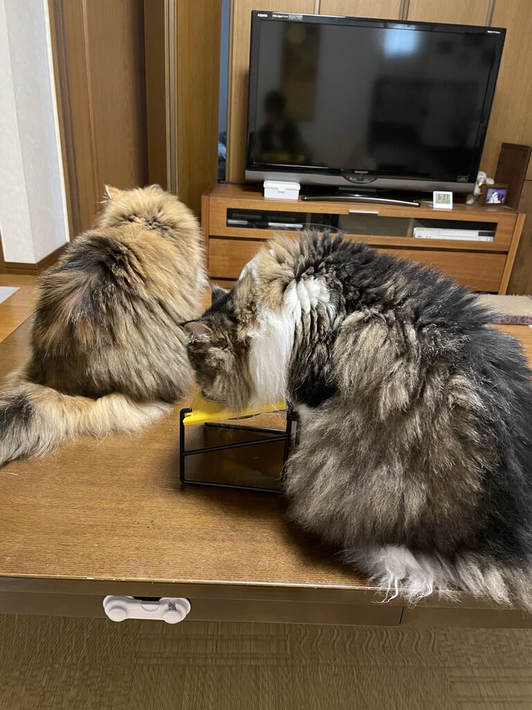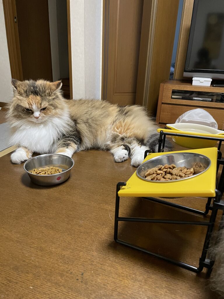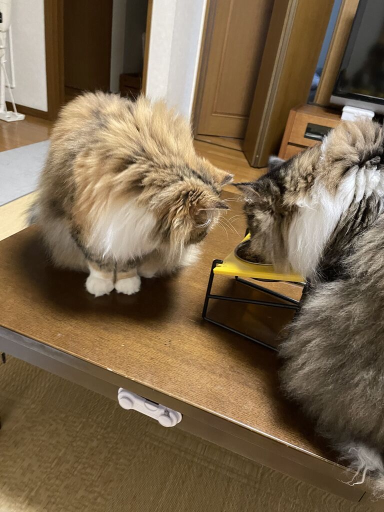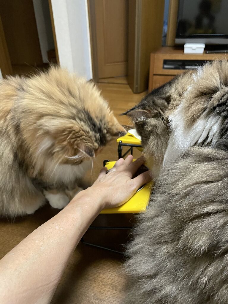 食べの悪かった朝、テンのカリカリを欲しがるなぎ。そこからはおさかなふりかけのにおい…