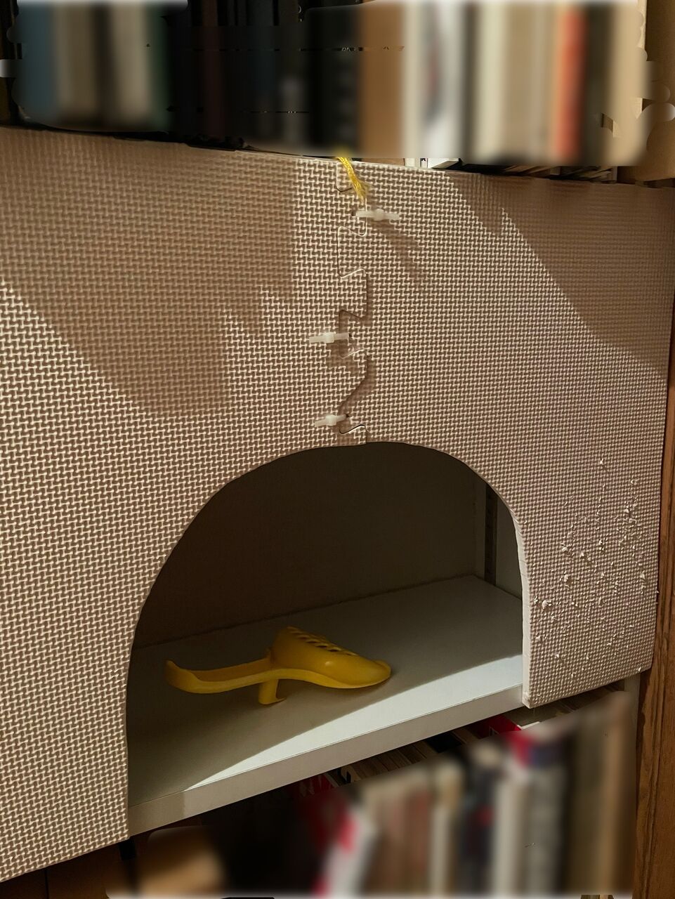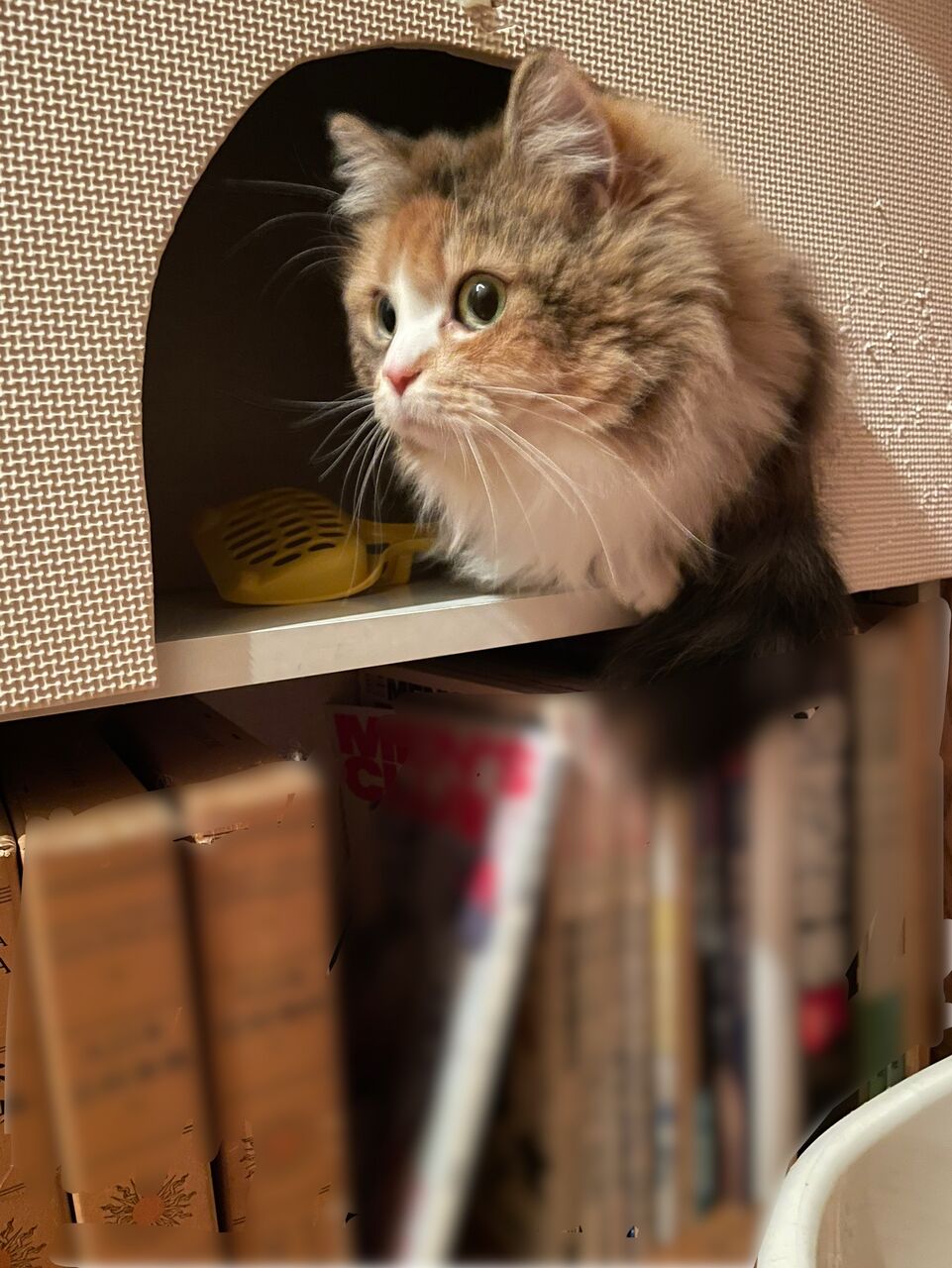 我が家は廊下に備え付けの本棚がある。私はそこを整理して場所を空け、なぎの隠れ場所を作った。