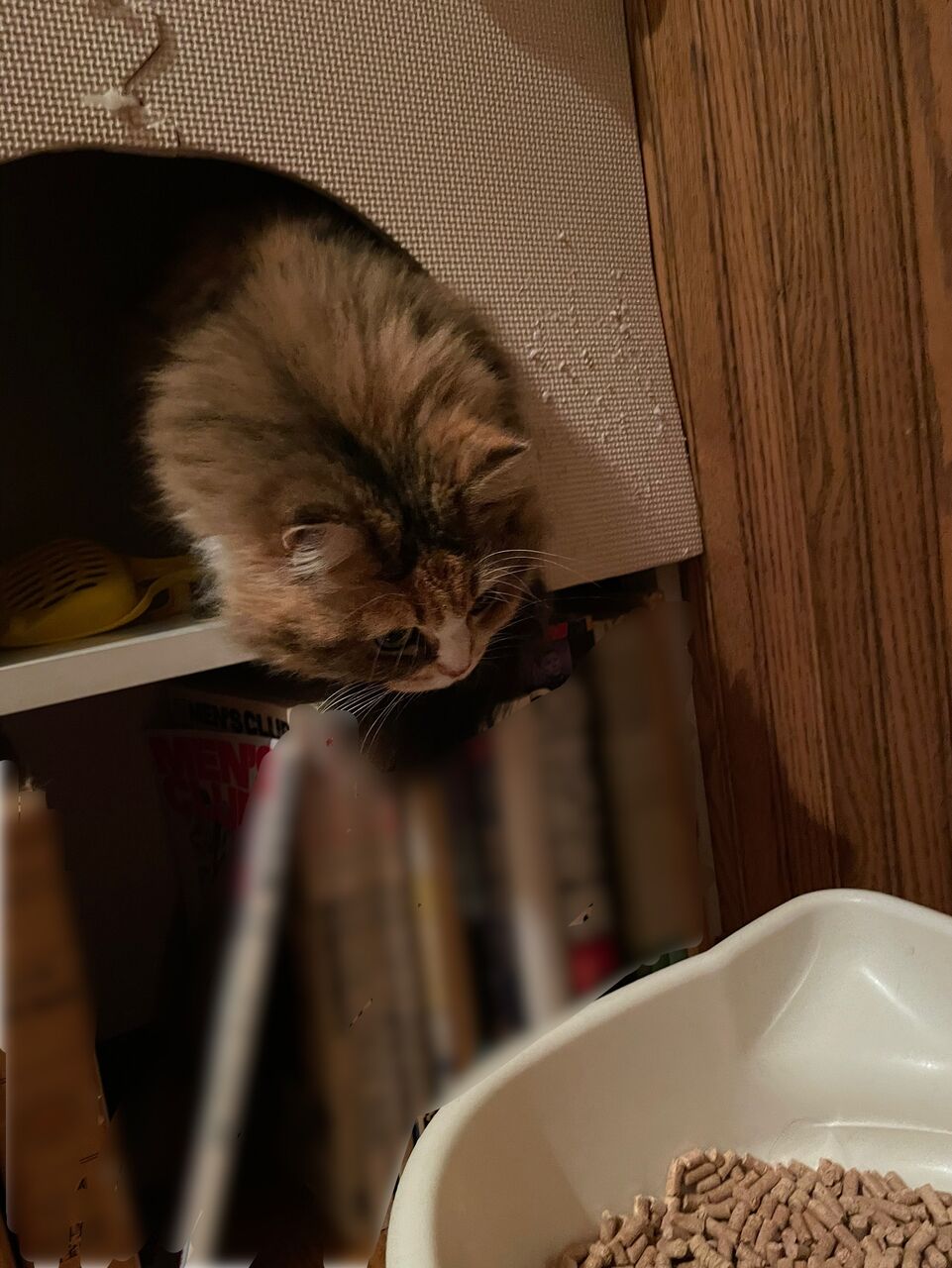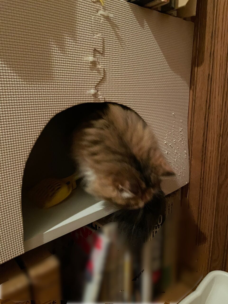 もう諦めて完全に忘れていたけれど、先日アゴをふかれるのがいやななぎが逃げ込んだのが、この秘密基地!慣れた感じで入り込む。