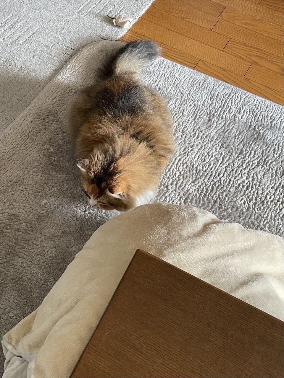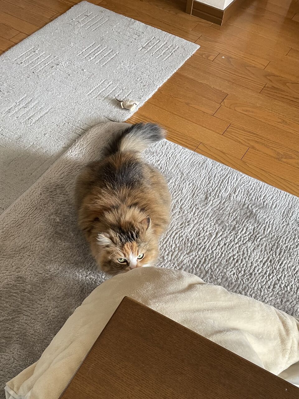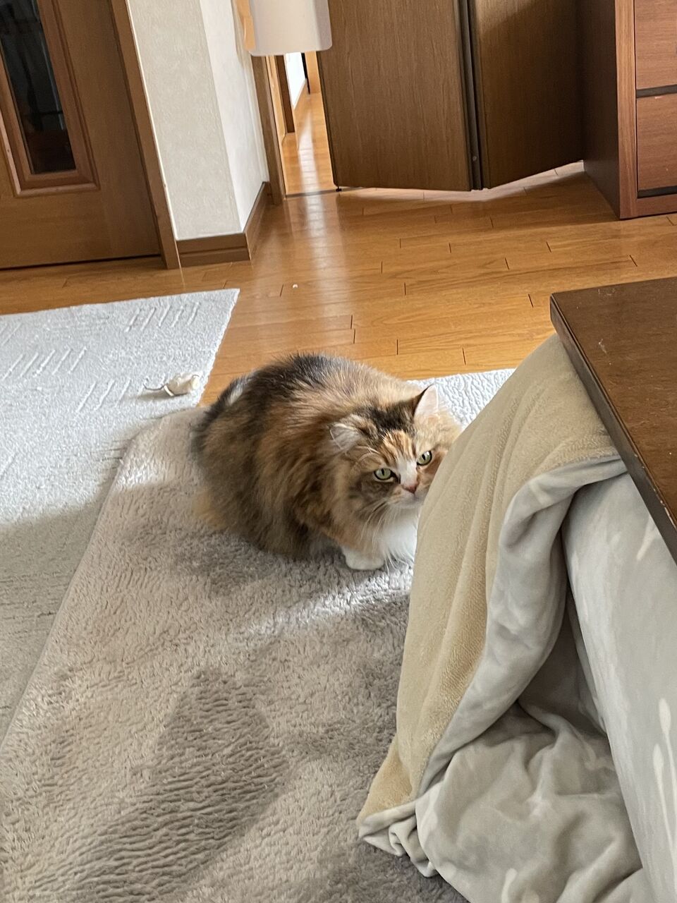 こたつの電源もつけてないの。毛が触れてやけどするといけないからね。自家発電(笑)で十分暖かい。
