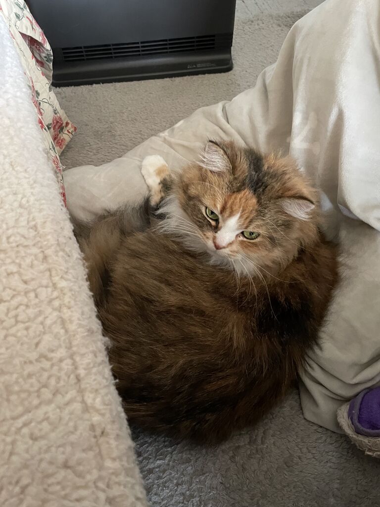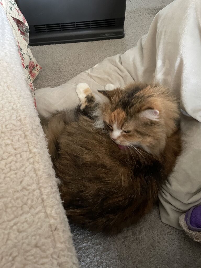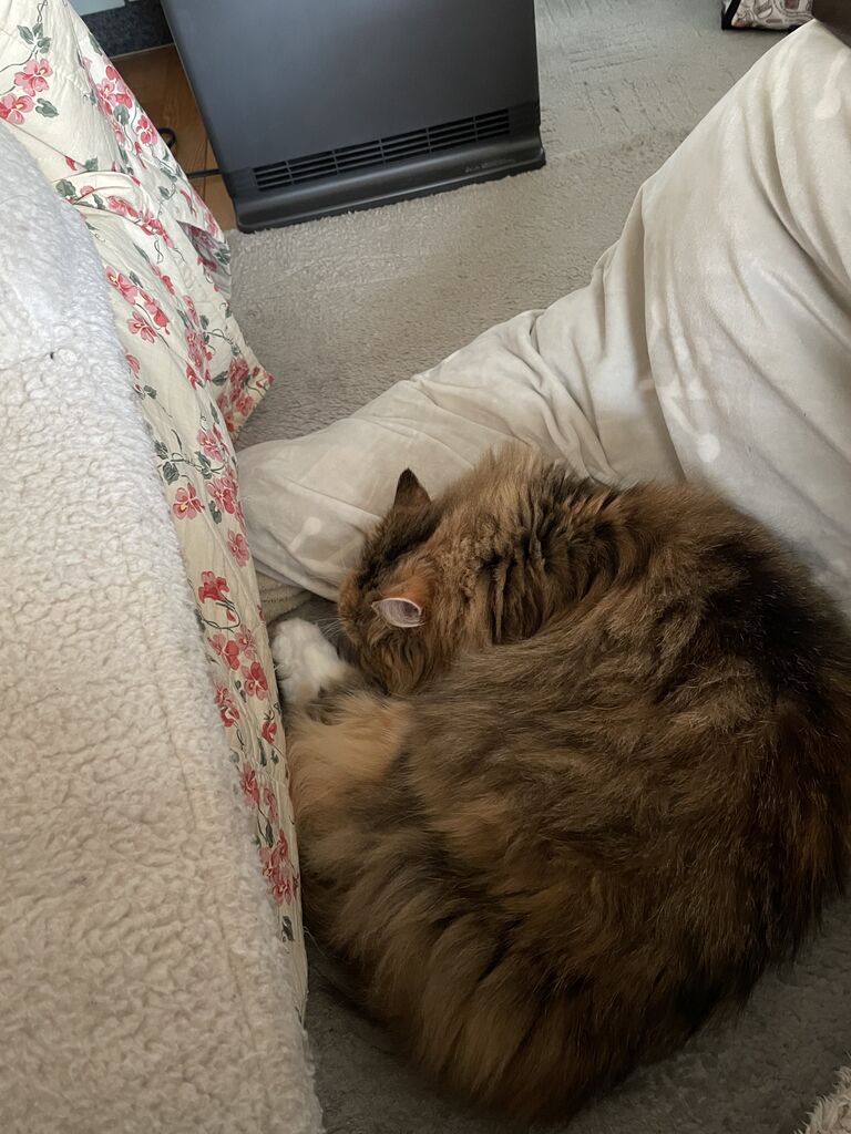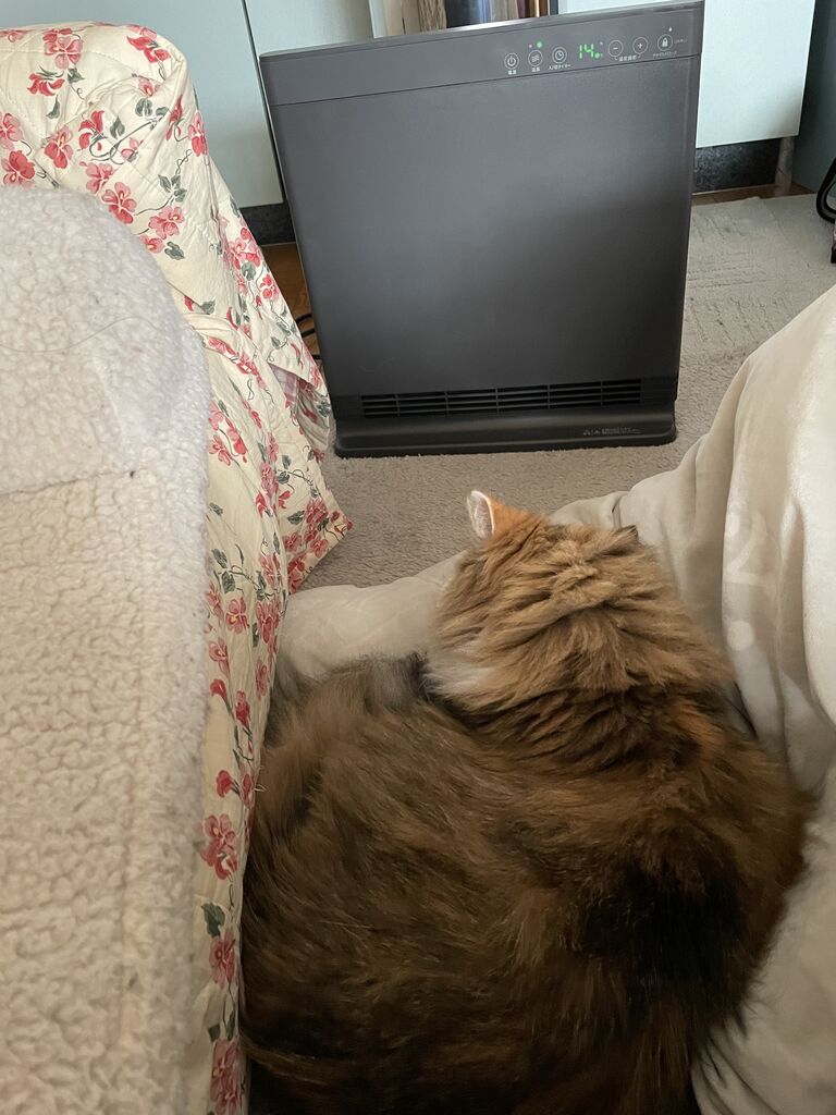 こんなブログを書いていたら、ゆっくり出てきてセラミックヒーターの前に陣取った。こんなの初めて。