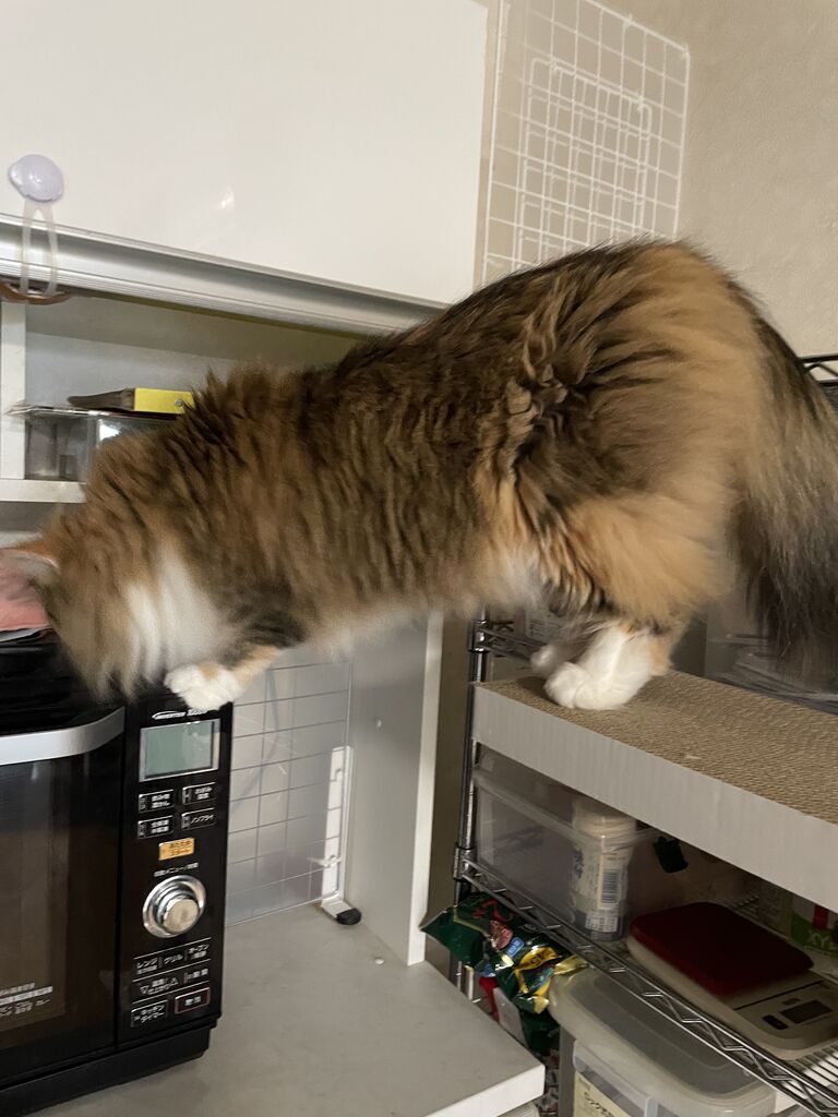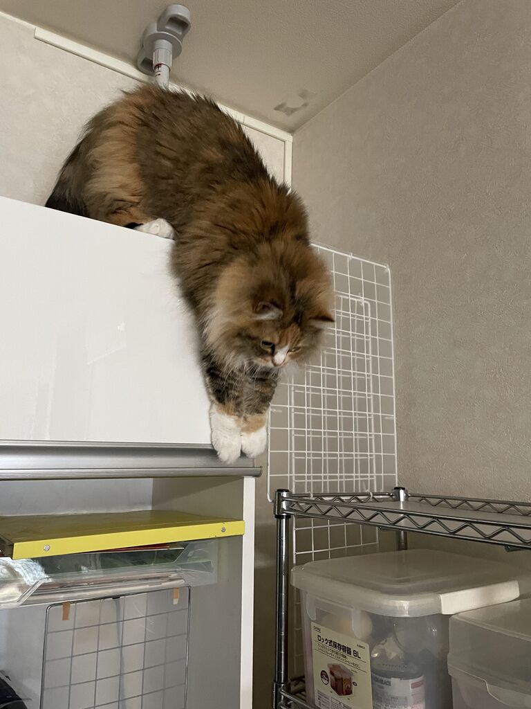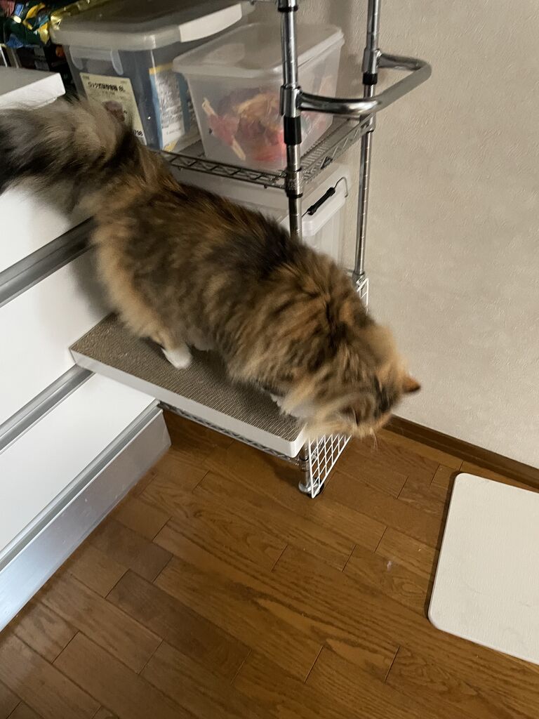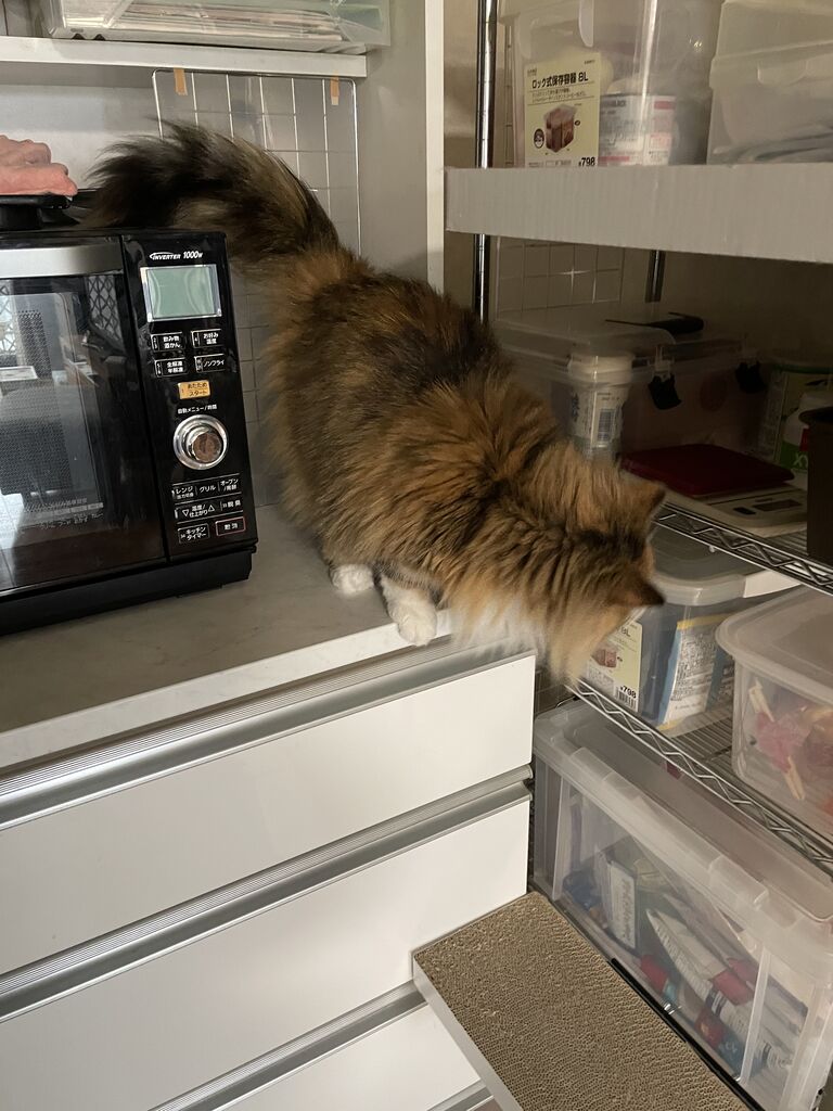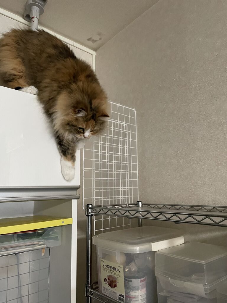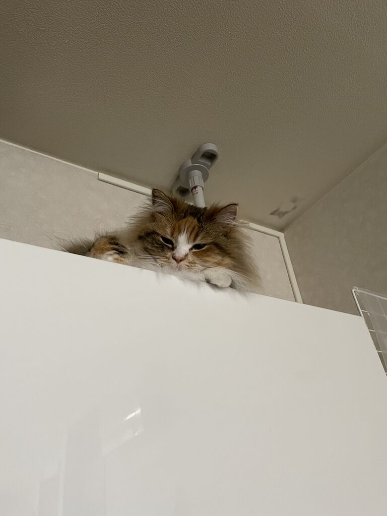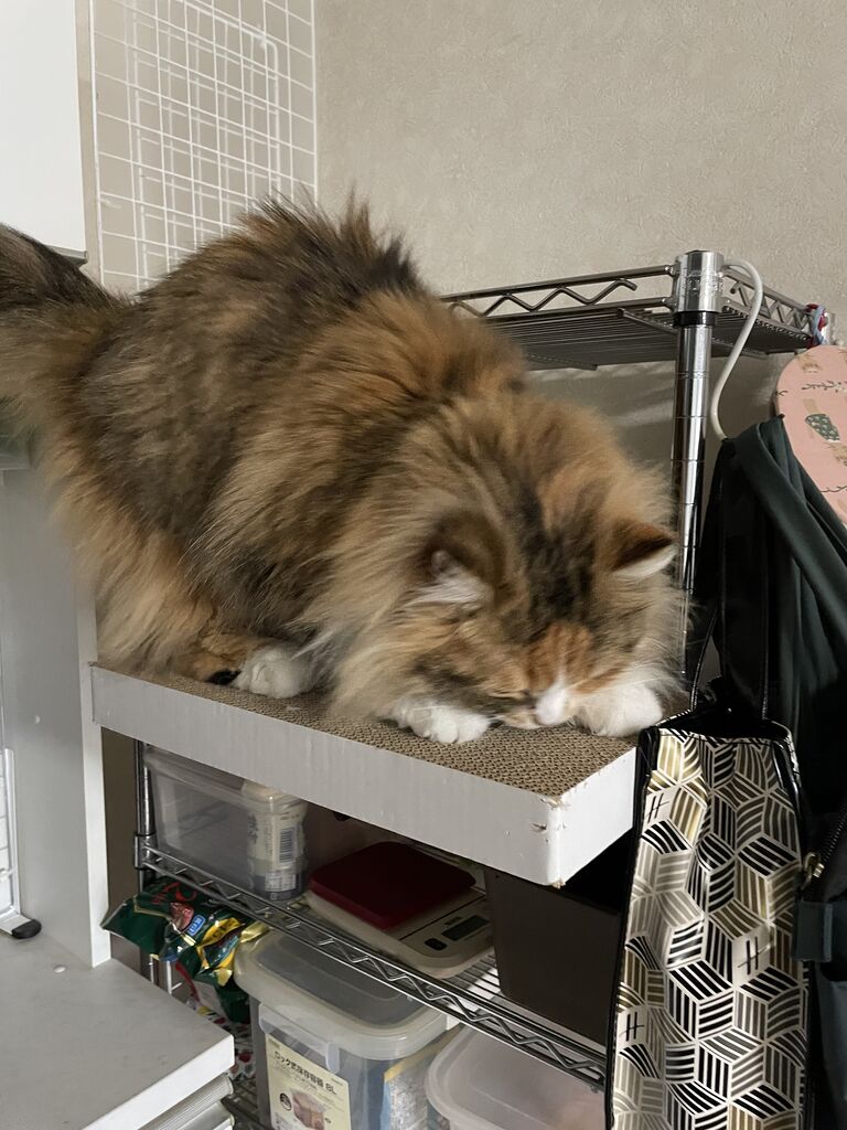 私たちの目を盗んで上ってしまうので、1年前のなぎの誕生日に整備して開放してあげた食器棚の上。