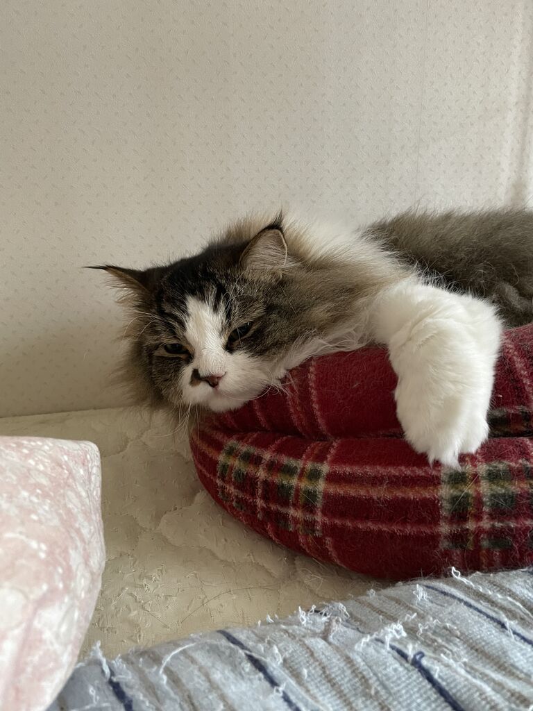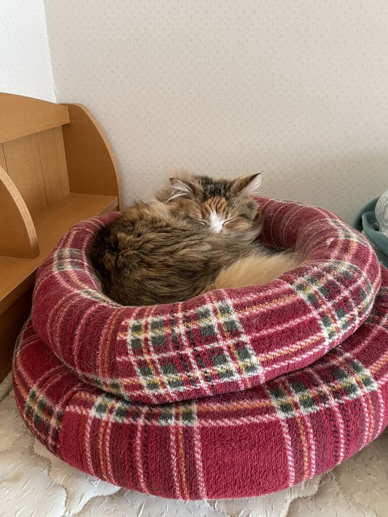 私自慢のベッドで眠るなぎと即席で作ったケースのベッドで眠るテンちゃん。
