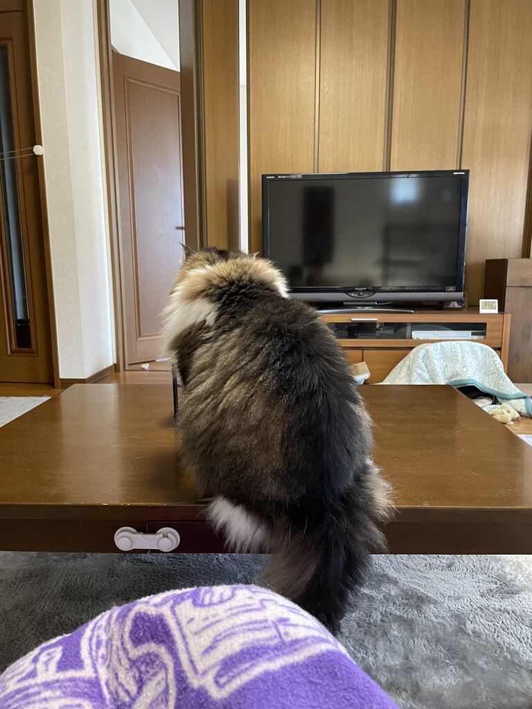 テレビを見ている飼い主、テンちゃんにもたれる。