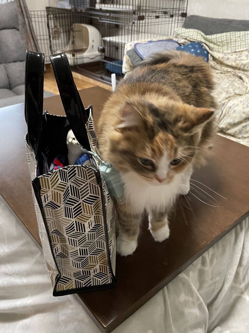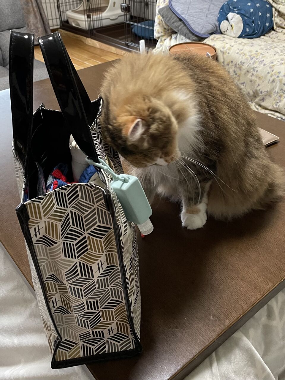 飼い主のお出かけバッグにすりすりするなぎ