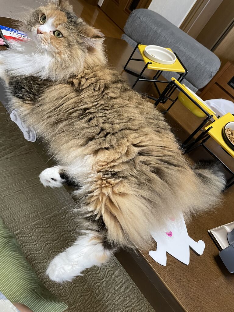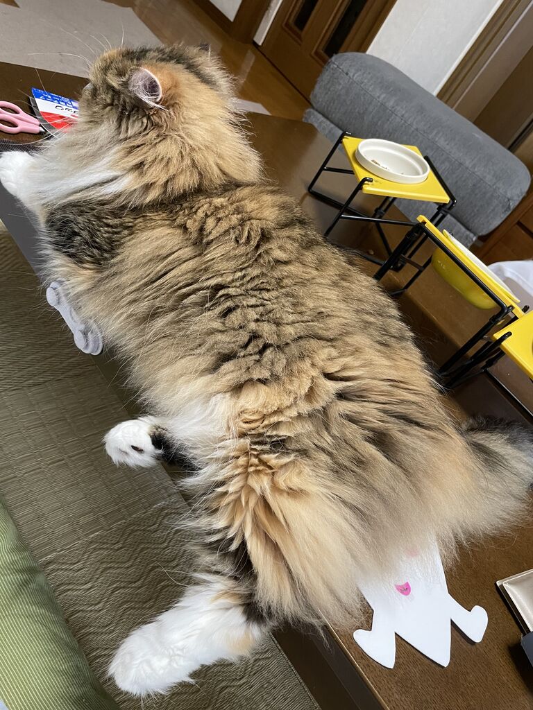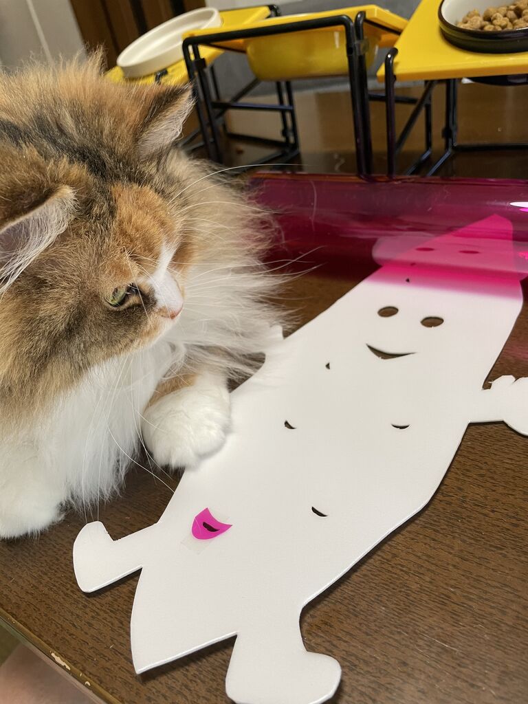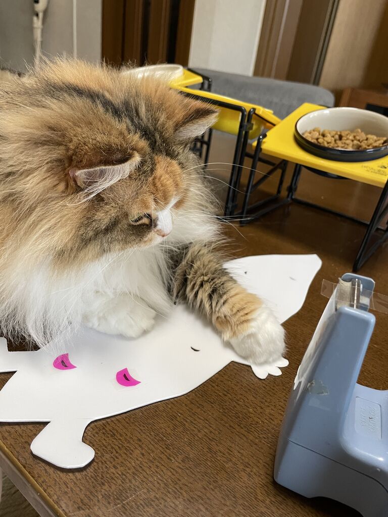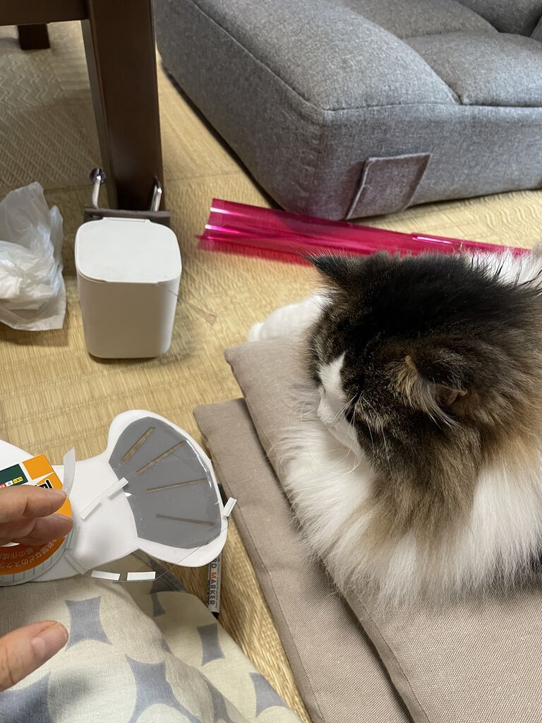 テンちゃんの"じゃま手伝い"は、6kgの体重で透明カバーに乗るから折れて跡がつきそう。ガリガリかじるし。