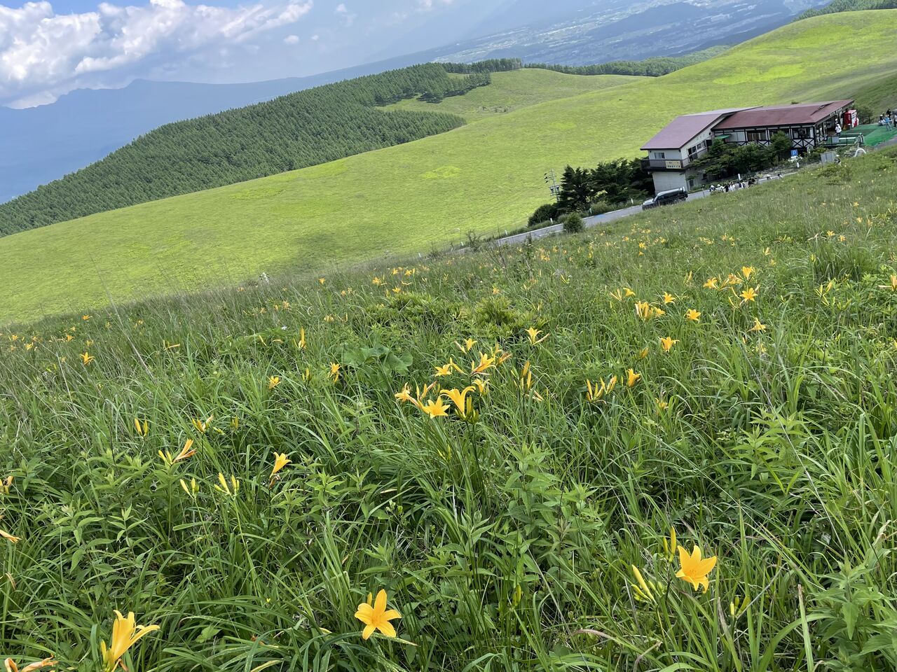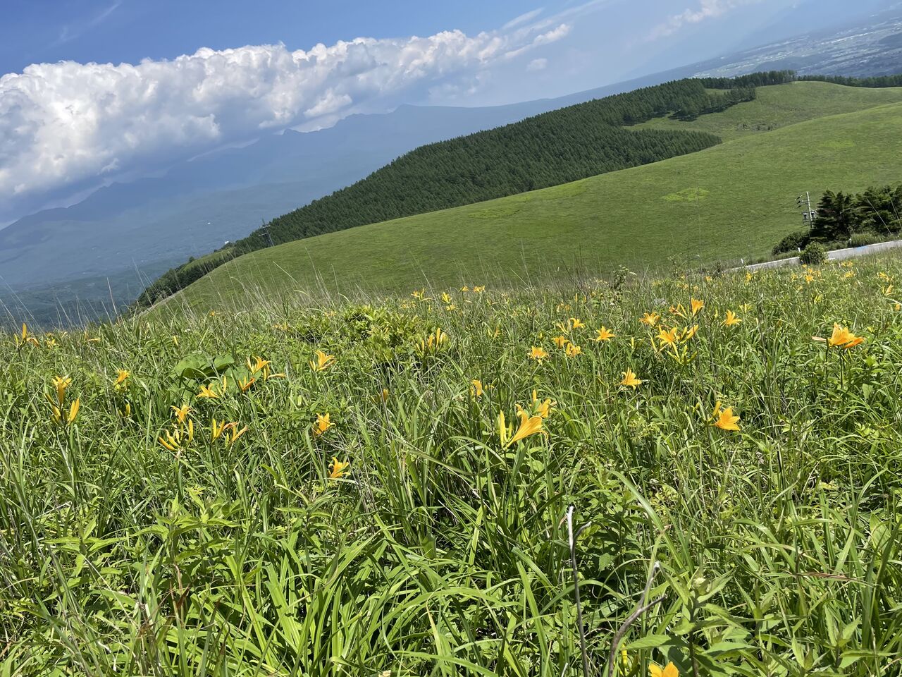 白樺湖の近く、車山から霧ヶ峰ではこの時期ニッコウキスゲが山の斜面に咲き乱れる。