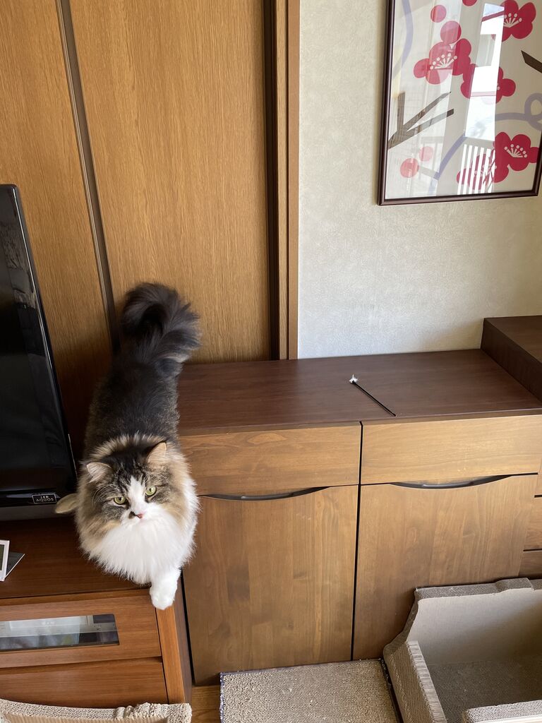 1ヶ所届かない高さがあって、テレビ台とチェストを階段のように上って掛けていた。でも上りにくくて不安になり脚立を使うことに。